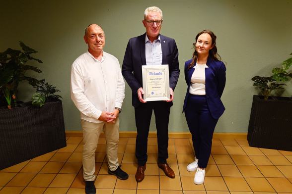 Unser neuer Ehrenvorstand Jürgen Oedinger, eingerahmt von den Vorständen Sabrina Hein und Mike Schäufle.