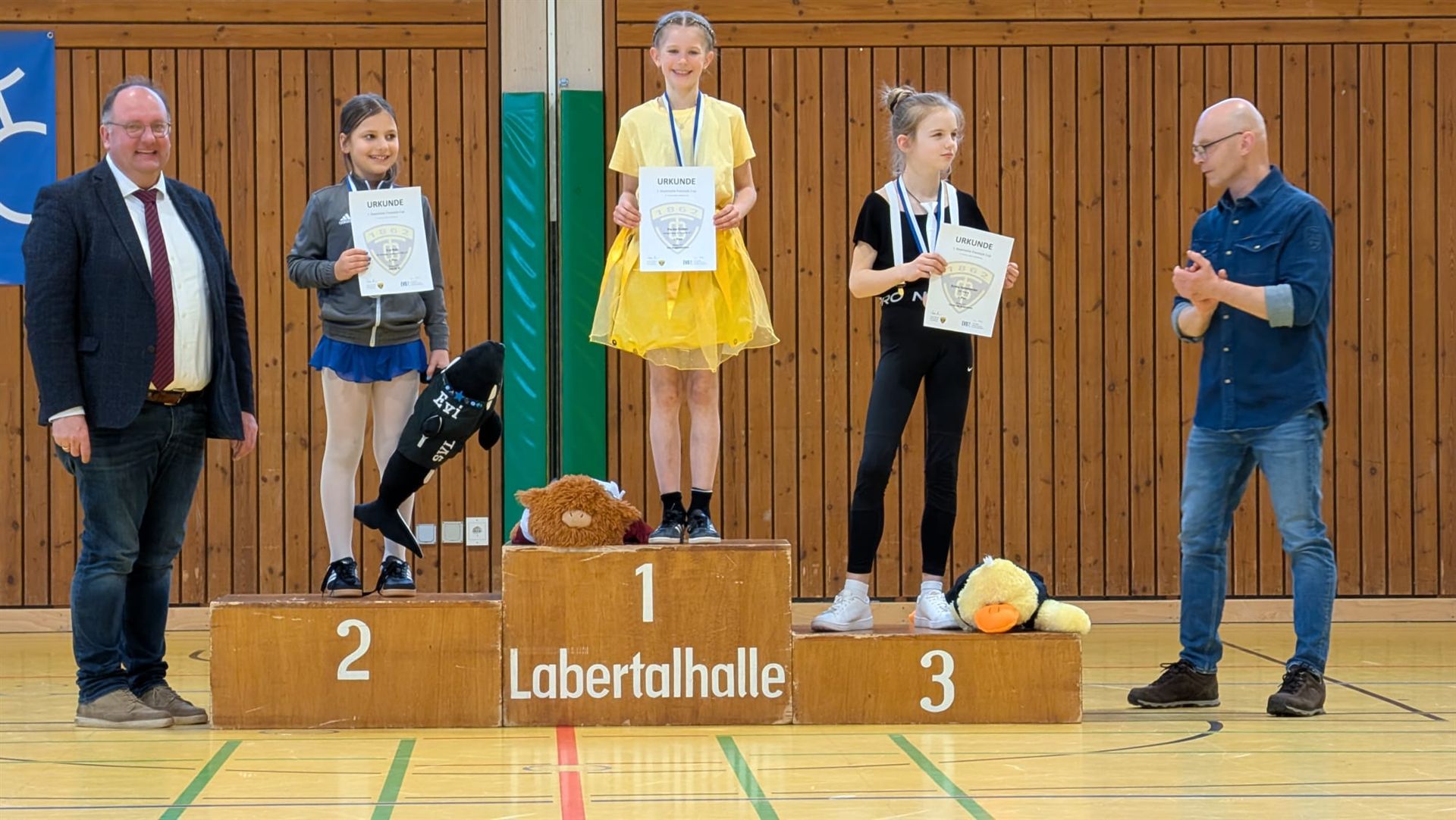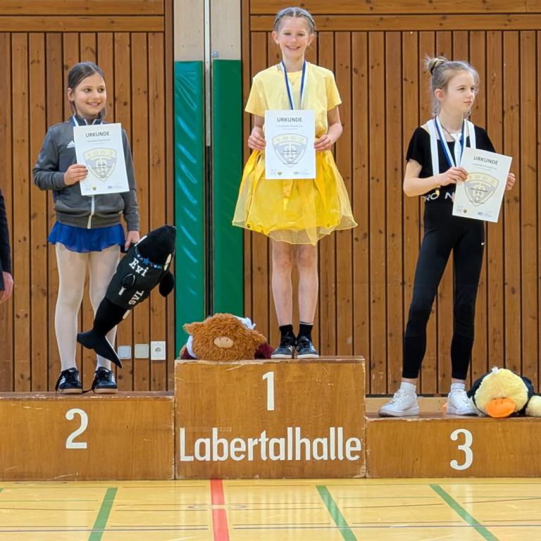 Unsere Mädchen zeigten beeindruckende Leistungen! Los ging es in der Altersklasse U11, in der Eva N. ihre Einzelkür präsentierte und mit einer wunderschönen Darbietung die Jury überzeugte und das Publikum verzauberte – am Ende durfte sie sich über einen hervorragenden 2. Platz freuen!